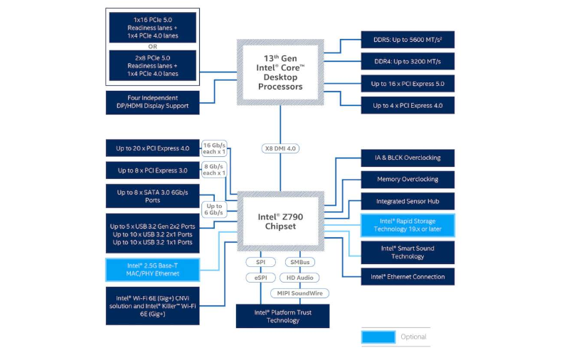 En effet, ces dernières sont toutes gérées par le chipset (ex Z790 ici), qui communique avec le bus DMI. Ce bus permet de sortir toutes les informations utiles du processeur, et destinées aux fonctions secondaires. Il se rapproche physiquement du PCIe. (Pour l'anecdote : sur les plateformes AM5, c'est du PCIe qui est utilisé entre le processeur et le chipset).