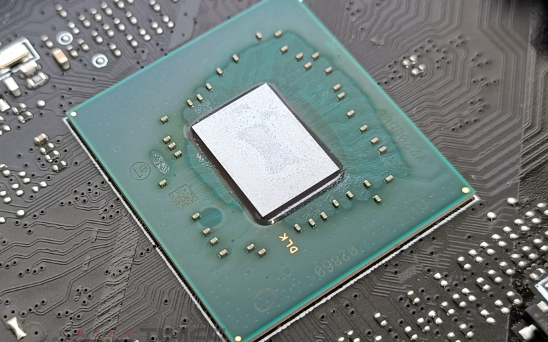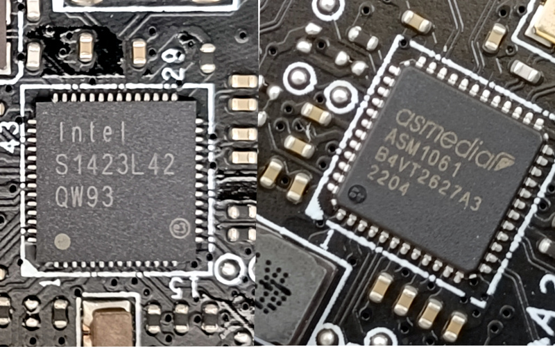 On peut commencer par trouver un contrôleur SATA (à droite), caché dans le coin inférieur droit de la carte mère. Il génère deux ports SATA à partir d'une ligne PCIe 1.0x1. Du côté de l'IO arrière, on commence avec deux exemplaires, l'Intel S1423L42 (à gauche). Derrière ce doux nom se cache un contrôleur Ethernet 2.5 Gbps. Ils profitent d'une ligne PCIe 3.0x1 chacun. Très proche, on retrouve la carte Wifi, une Intel AX211, elle aussi alimentée en PCIe 3.0x1. Et maintenant, de l'USB un peu rapide avec le double port thunderbolt 4 : Lui, c'est carrément 4 lignes PCIe 4.0 qui lui sont dédiées pour encaisser les 2x 40 Gbps de chaque port.