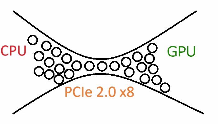 Dans ce deuxième cas, le bottleneck n'est non pas causé par les composants, qui sont tous deux capables de fournir et/ou recevoir suffisamment de donnée, mais pas le moyen de communication employé. Dans l'image ci-dessus, c'est le bus PCIe 2.0 x8, relativement vieux qui limite les transferts, et donc les performances du système.